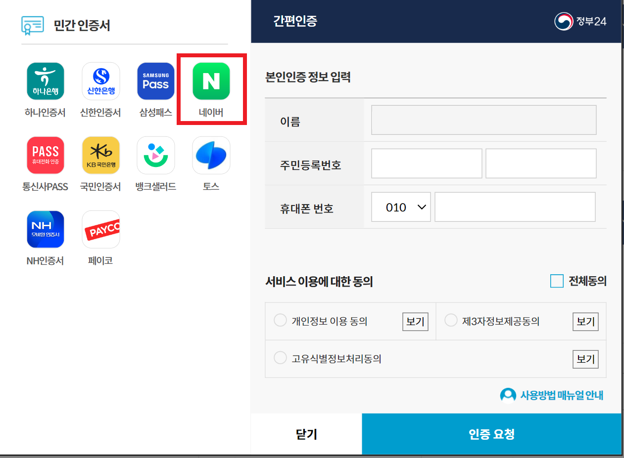 [간편인증]은 민간 기관에서 제공하는 인증서를 휴대폰 어플리케이션과 연동하여 인증하는 방식입니다. 가지고 계신 민간 인증서를 선택하고 본인 인증 정보 입력 및 서비스 이용에 대한 동의를 진행하면 됩니다. 간편인증서의 예시로 네이버 인증서를 보여드리겠습니다. 입력하신 정보를 확인 후 아래 [인증 요청]을 누르면 간편인증이 시작되고 컴퓨터에 아래 사진과 같은 화면이 나옵니다.