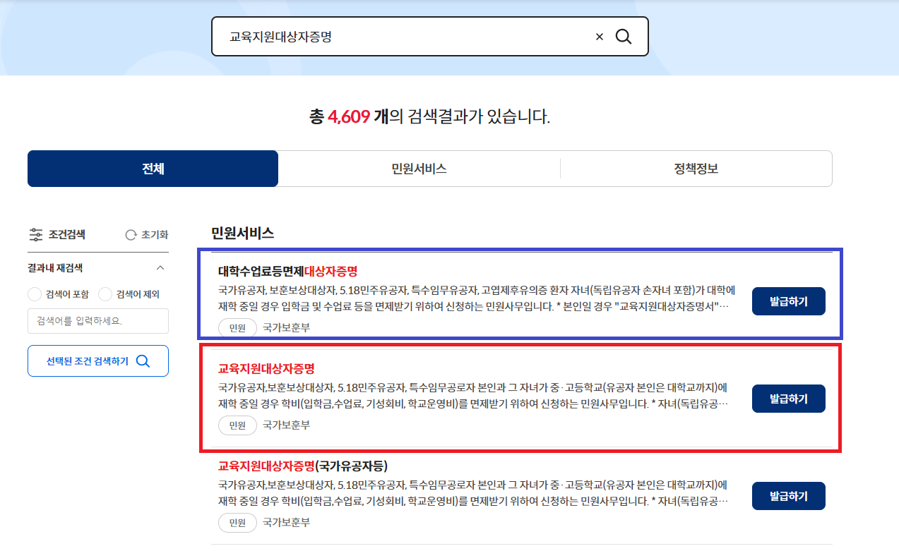검색결과 화면에서 다음 사진과 같이 [교육지원대상자증명] 민원 사무 옆에 있는 [발급하기]를 누릅니다. [교육지원대상자증명(국가유공자등)]을 통해 [발급하기]를 누르셔도 상관없습니다.