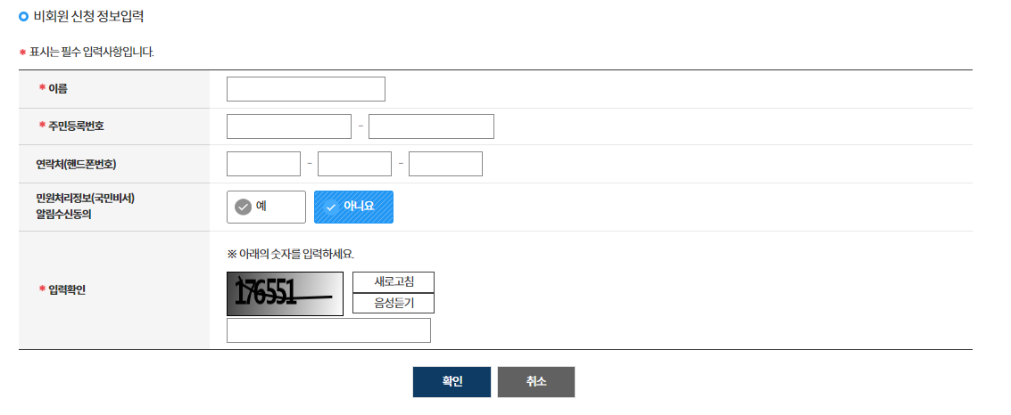 아래로 내려가셔서 [비회원 신청 정보 입력]에 이름, 주민등록번호, 연락처 등의 정보를 순차적으로 입력하고 아래 [확인] 버튼을 눌러줍니다.