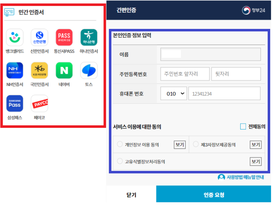 [간편인증]을 위한 민간 인증서를 발급받으신 홈페이지나 어플을 빨간색 네모박스로 표시된 왼쪽에서 선택하신 후, 오른쪽 네모 박스 안에 개인 정보와 이용에 대한 동의를 마무리하신 후 아래 [인증 요청]을 눌러서 마무리 하시면 다음과 같이 출력할 수 있는 화면이 나옵니다.