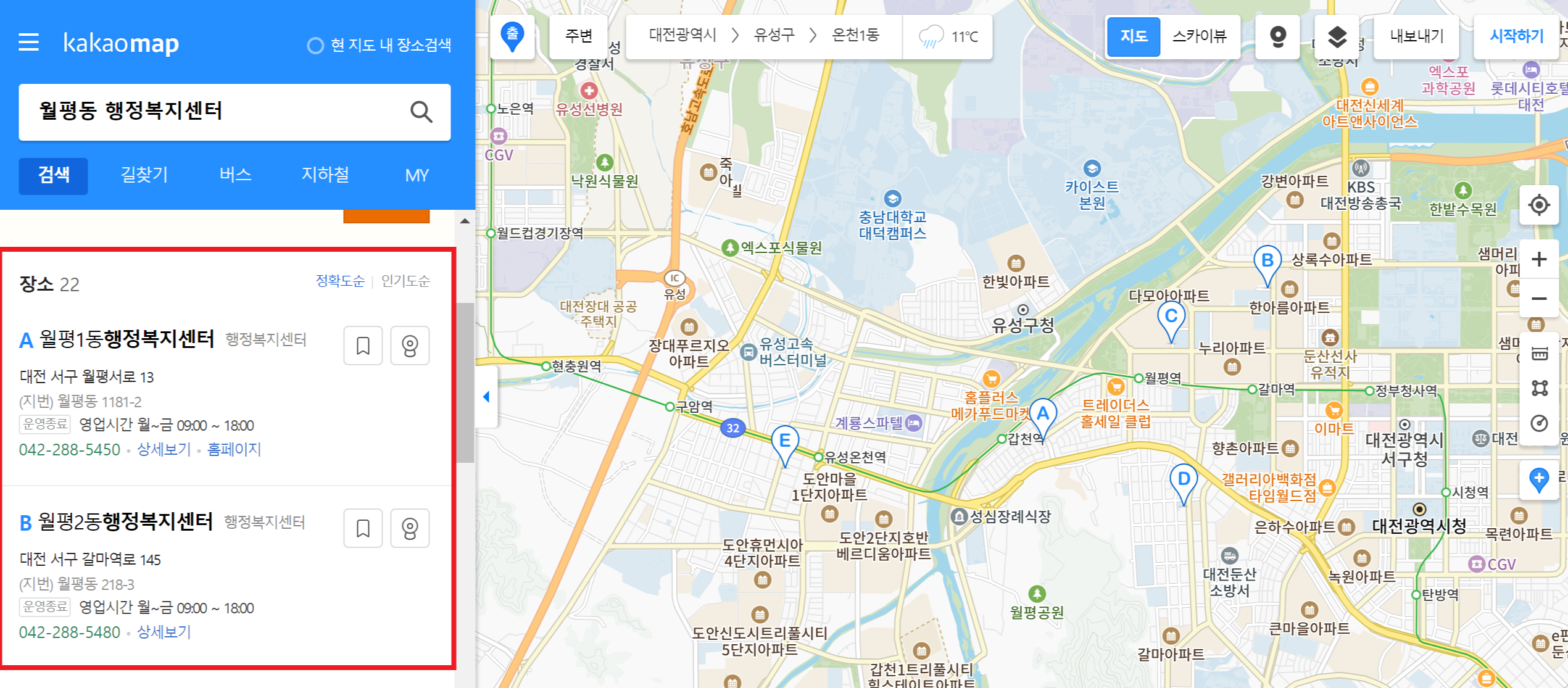 카카오맵에 접속하시면 왼쪽 상단에 목적지를 검색하는 창이 있습니다. 해당 검색창에 [동이름] [행정복지센터]를 같이 입력하시면 됩니다.