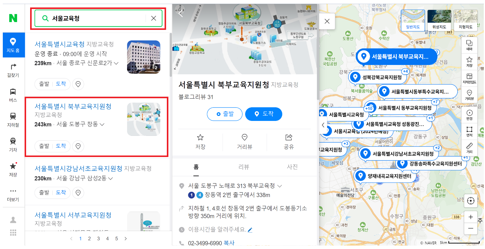 그리고 위 사진의 초록색 네모박스에서 대중교통, 자동차, 도보, 자전거 등 이동 수단을 선택하면 가는 길, 방법, 예상시간 등이 나옵니다. 출발하시기 전에 네이버 지도 첫 화면의 검색창에 해당 학교를 검색하신 후 아래 사진과 같이 제공되는 전화번호로 사전에 전화하신 후 방문하시면 민원을 빠르게 처리할 수 있습니다.