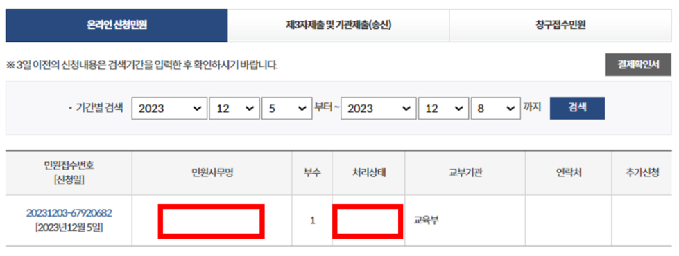 절차가 마무리 되면 위 사진과 같이 민원 사무명에서 [국민기초생활수급자 증명서]가 나오며, 처리상태에서 [출력하기] 또는 [발급하기] 버튼을 확인하실 수 있습니다.