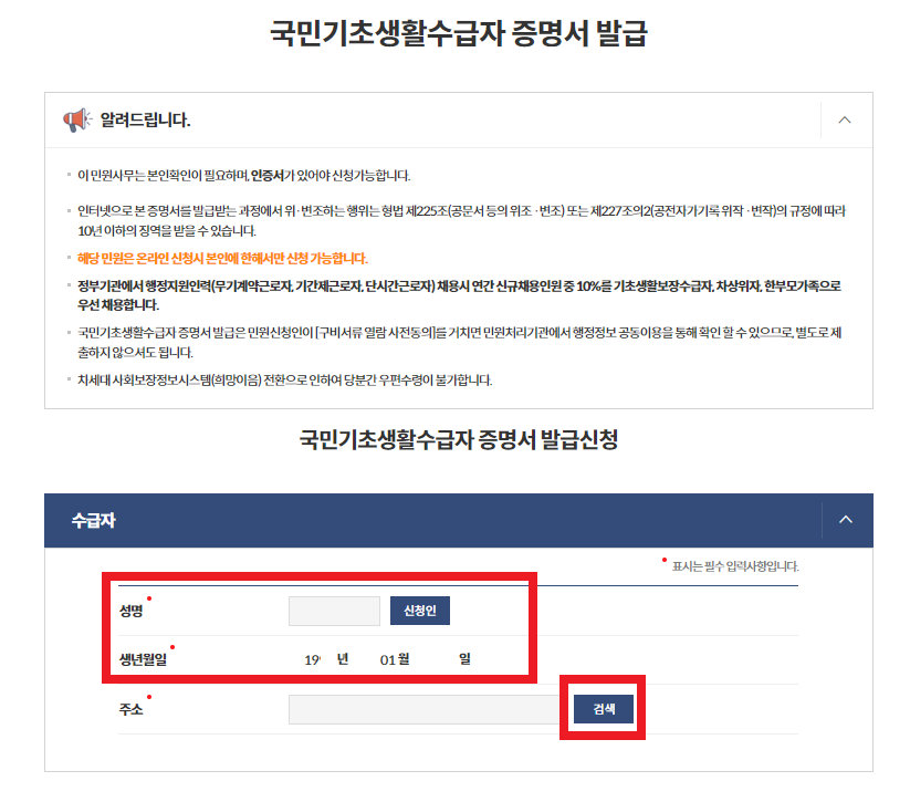 [확인]을 누르시면 다음과 같이 증명서 발급 안내 내용과 발급 신청하는 수급자 정보를 입력하는 란이 나옵니다.