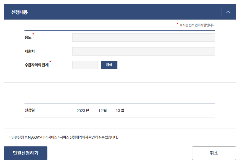 세대주 성명, 관계, 수령방법, 수령기관 선택(직접 발급 일 경우 기관 선택)을 입력하신 후 아래 신청내용에 [용도]와 [제출처]를 기입하시면 됩니다. 그리고 제일 아래에 [민원신청하기]를 누르시면 신청 절차가 완료됩니다.