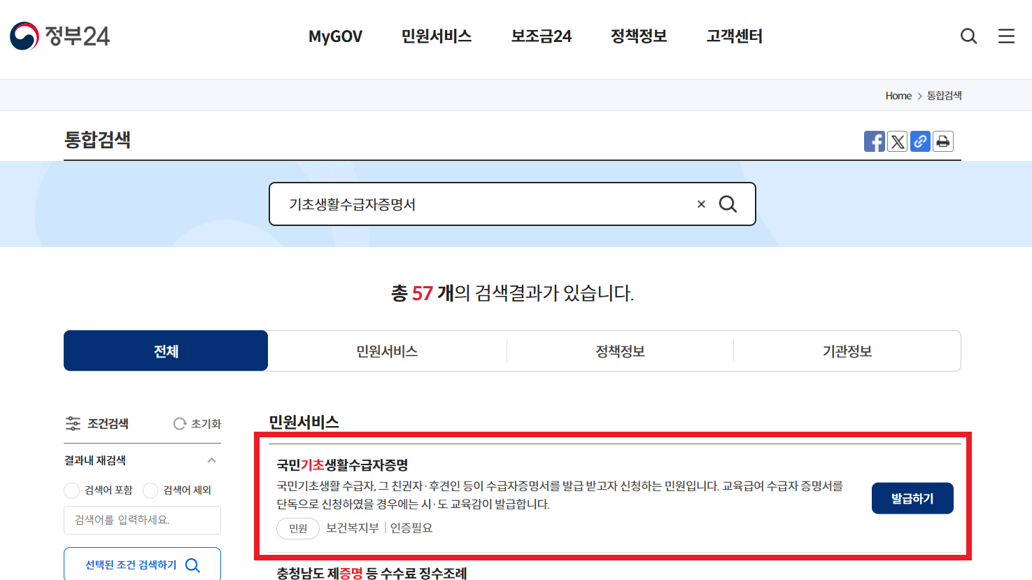 정부24 홈페이지에 접속하셔서 검색창에 [기초생활수급자 증명서]로 검색합니다.