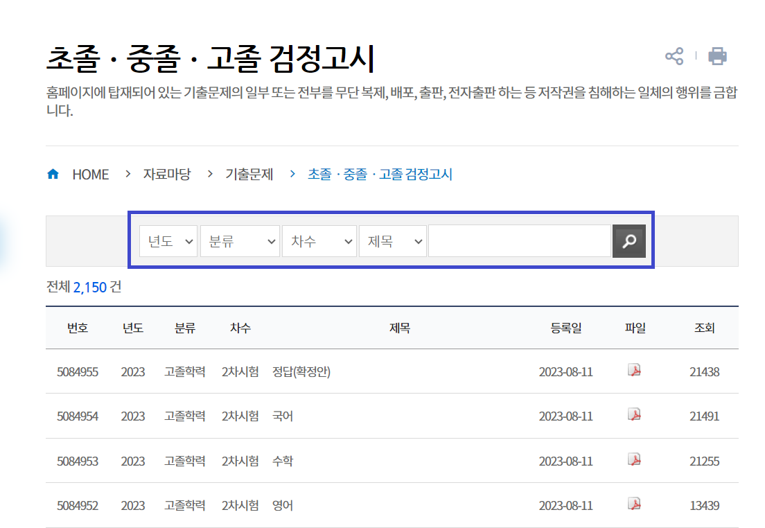 위의 링크를 통해 한국 교육과정 평가원에 접속하시면 다음과 같은 검색창을 확인하실 수 있습니다. 아래의 검색창에서 파란색 네모박스 안에 [연도]를 선택하신 후, [분류]에서 초졸, 중졸, 고졸을 선택하시면 됩니다. [차수]는 연간 2회 시험이 실시 되기 때문에 1차 시험, 2차 시험 중 선택하실 수 있으며, 마지막으로 [제목] 옆에 원하시는 과목명을 입력하시면 됩니다.