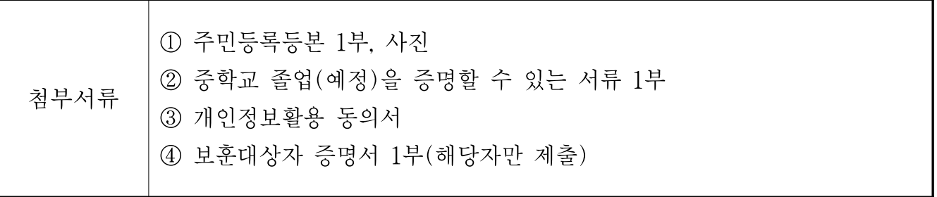 제출 서류는 신입학의 경우 다음과 같습니다. 주민등록등본, 증명사진(가로 3.5cm x 세로 4.5cm), 중학교 졸업증명서 또는 졸업 예정증명서는 반드시 챙겨야 하는 서류입니다.