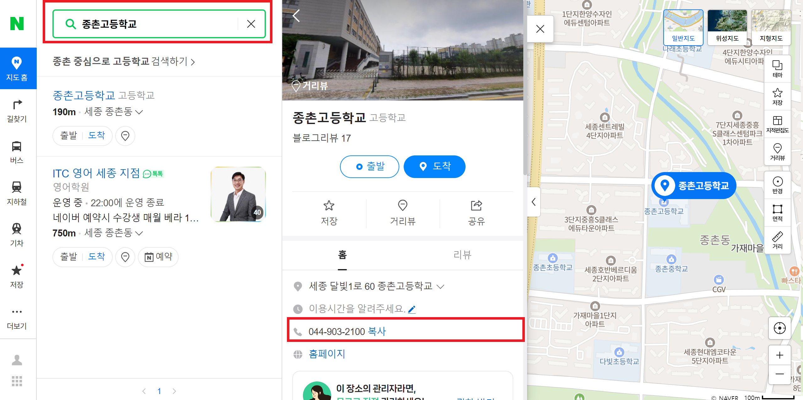 그리고 위 사진의 초록색 네모박스에서 대중교통, 자동차, 도보, 자전거 등 이동 수단을 선택하면 가는 길, 방법, 예상시간 등이 나옵니다. 출발하시기 전에 네이버 지도 첫 화면의 검색창에 해당 학교를 검색하신 후 아래 사진과 같이 제공되는 전화번호로 사전에 전화하신 후 방문하시면 민원을 빠르게 처리할 수 있습니다.