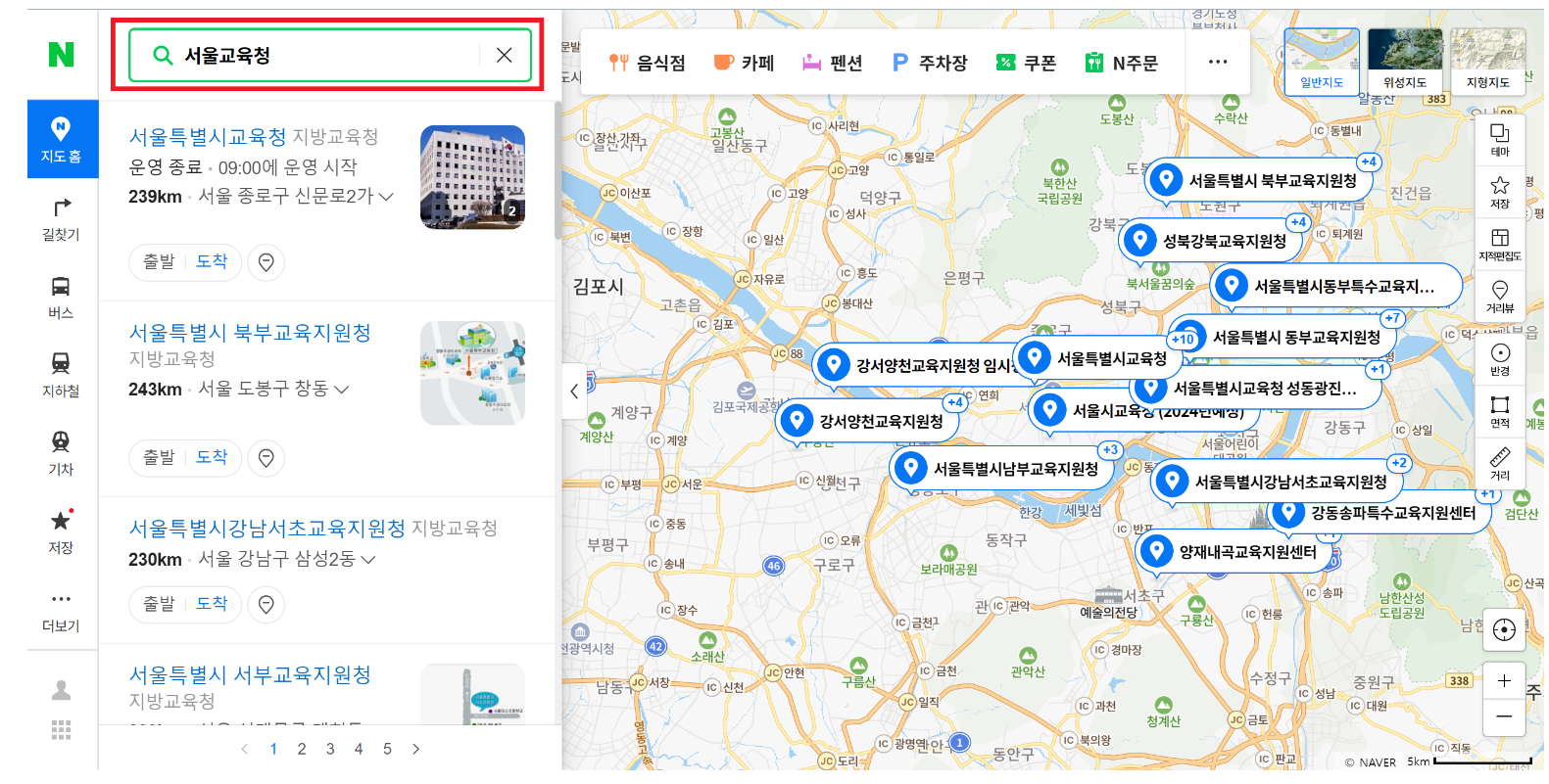 네이버 지도에 접속하신 후 왼쪽 상단의 검색창에 [지역명]과 [교육청]을 함께 입력합니다. 예를 들면 서울교육청, 대구교육청, 대전교육청 등과 같이 입력하시면 됩니다. 검색하시면 아래 사진과 같이 검색하신 지역에 있는 모든 교육지원청과 교육청이 나옵니다.