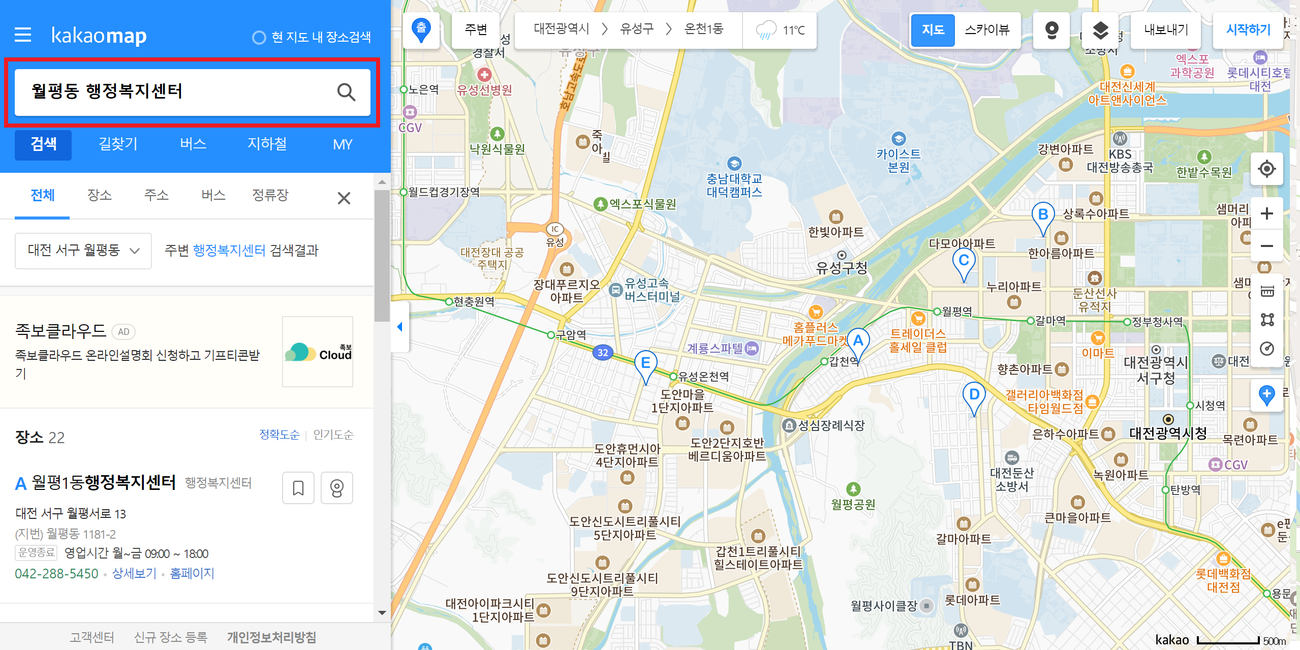 카카오맵에 접속하시면 왼쪽 상단에 목적지를 검색하는 창이 있습니다. 해당 검색창에 [동이름] [행정복지센터]를 같이 입력하시면 됩니다.